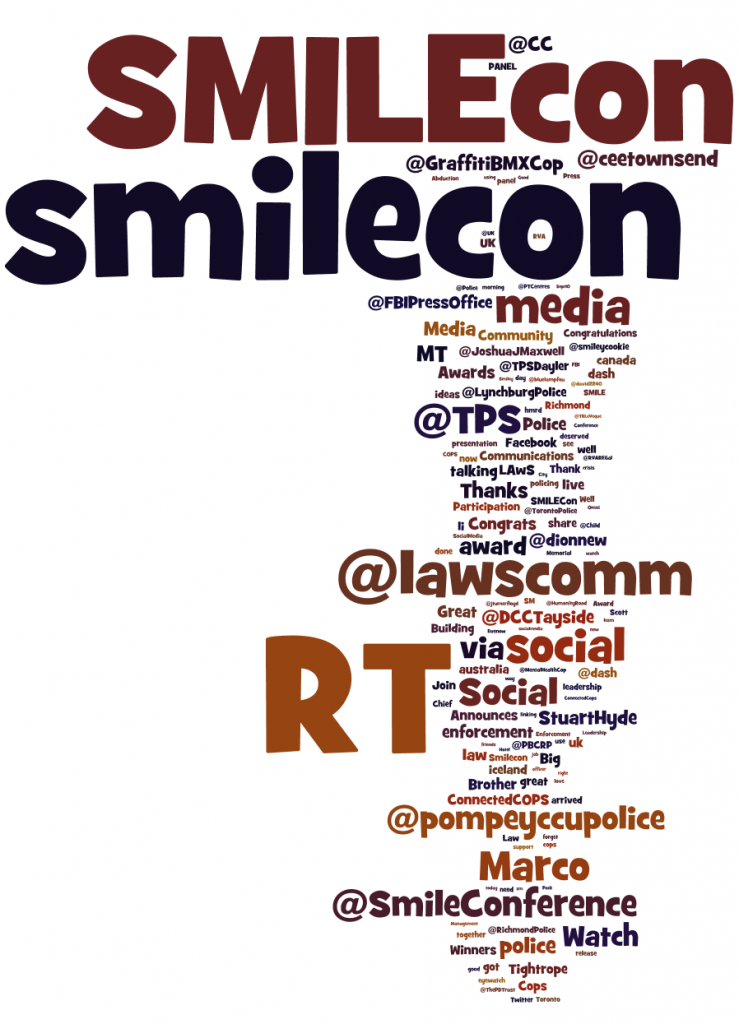 As of Wednesday at noon EST, we harvested all the conversation around the #SMILEcon hashtag. There were 2200 messages in just under three days with Marco and Dion leading the way in number of messages sent. As you can see from our word cloud from our monitoring tool, @lawscomm, @TPS, StuartHyde and of course social media were hot topics at the conference.