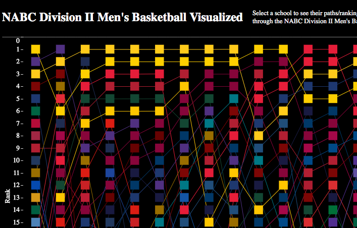 Plus, Augustana’s winning streak inspired me to put together this visualization of the NABC Division II Men’s Basketball polls, detailing the rankings from the start of the season back in October.
