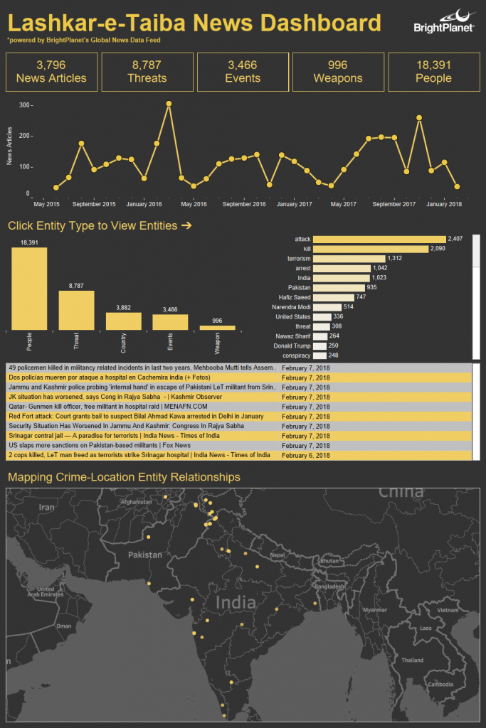 We recently received a request to analyze news focusing on Lashkar-e-Taiba, an active militant terrorism organization located in South Asia. This is a simple task by using BrightPlanet’s REST API to export data from the Global News Data Feed. The data load contains everything you need to perform a thorough analysis, including: